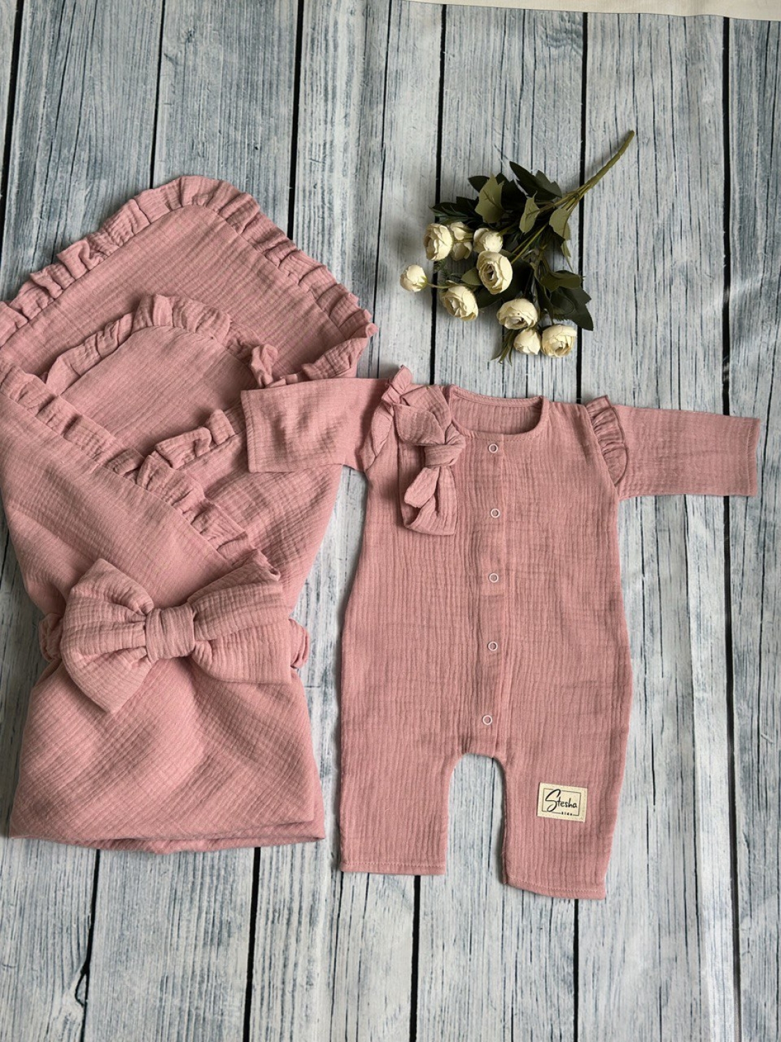 Теги: Купить детские конверты, комбинезон оптом, детские конверты на выписку оптом. 335-П. Комплект из детского комбинезона, р 56 и конверта муслин, хлопок 100% 90/90 см, пудра цена,отзывы официальный сайт "Стеша Зеленокумск"